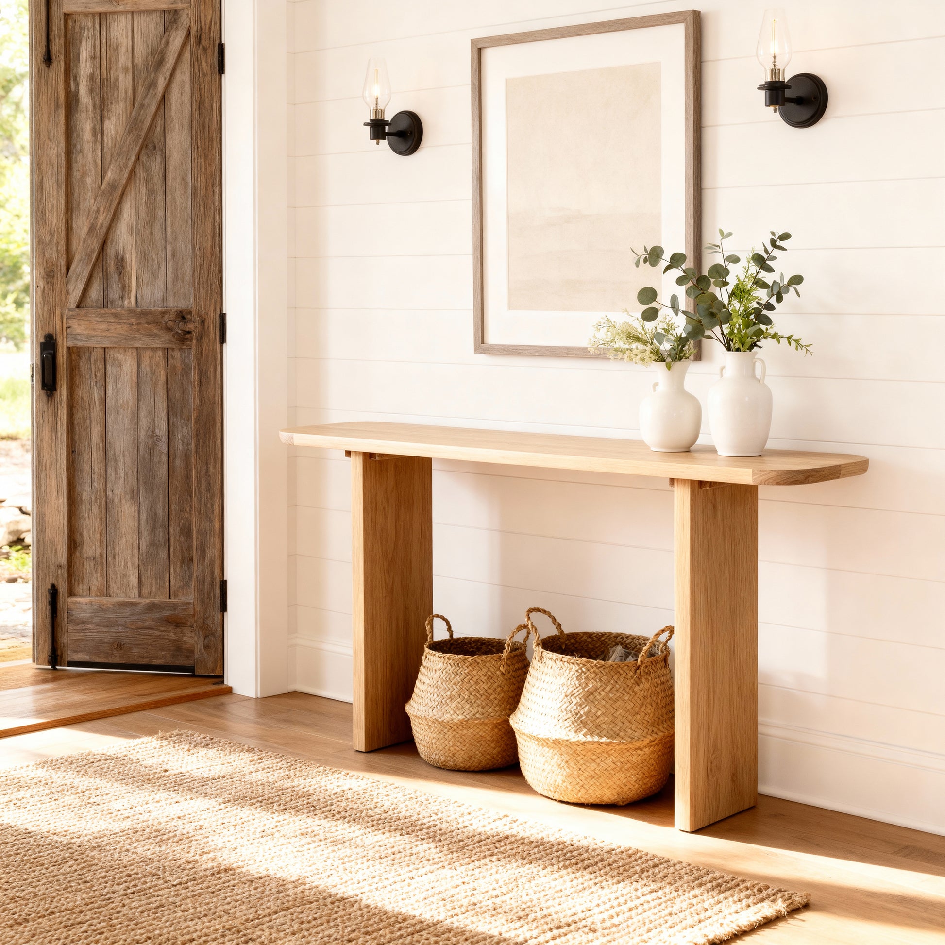 Liverpool Console Table (Natural) brings a clean, modern aesthetic to any entryway or living space with its smooth rounded edges and warm natural wood tones. Crafted from a durable blend of solid Pine and MDF veneer Oak, it offers reliable stability while showcasing a refined, consistent grain. Its long, slim tabletop provides ample space for décor, accents, or everyday essentials, while the solid panel legs add strength and architectural elegance.
