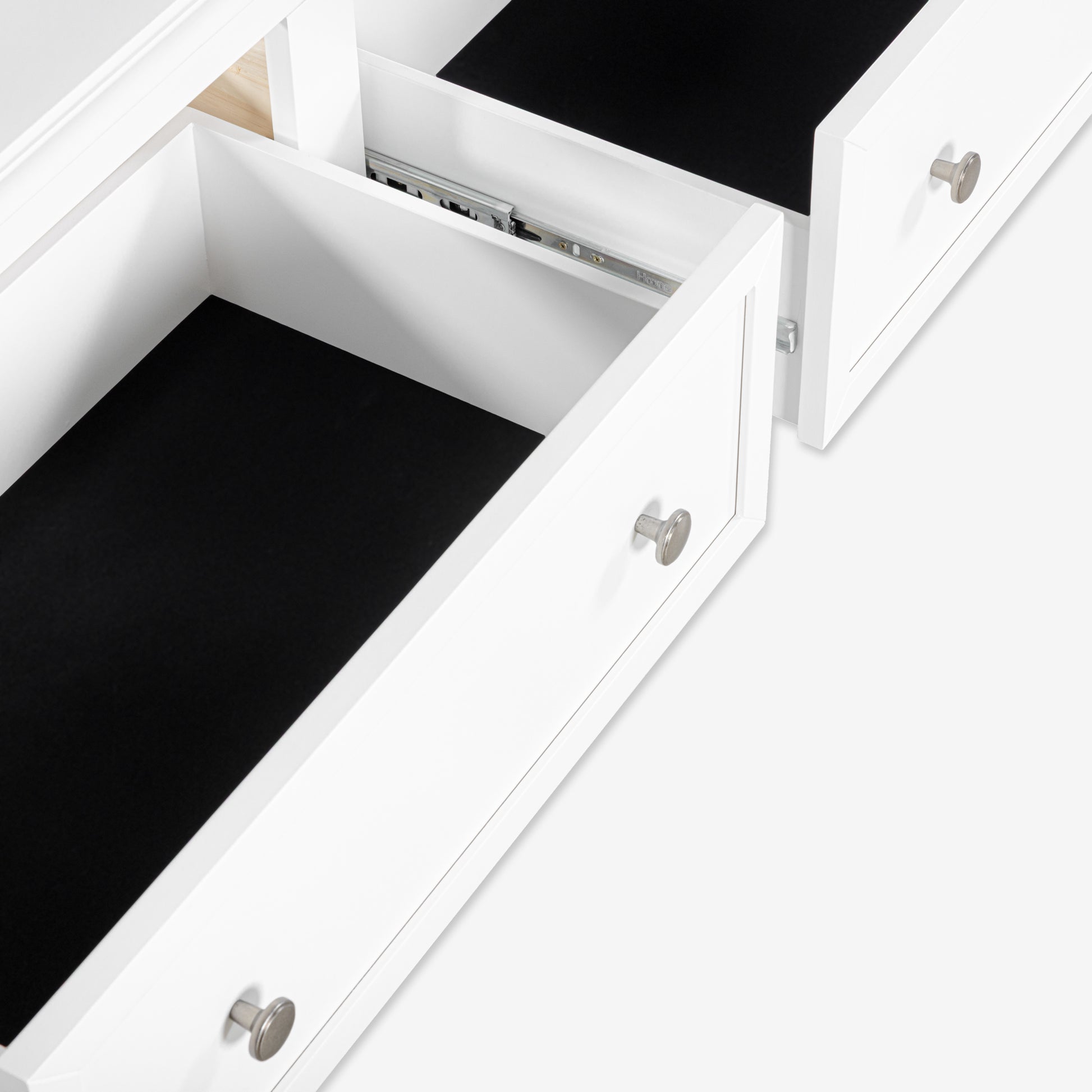 The Manchester Double Bed with Drawers blends classic design with everyday function. Its crisp white finish, panelled headboard, and moulded detailing bring timeless elegance, while two smooth-gliding drawers at the foot offer discreet storage for bedding or essentials. Grey round handles add a clean, modern touch.