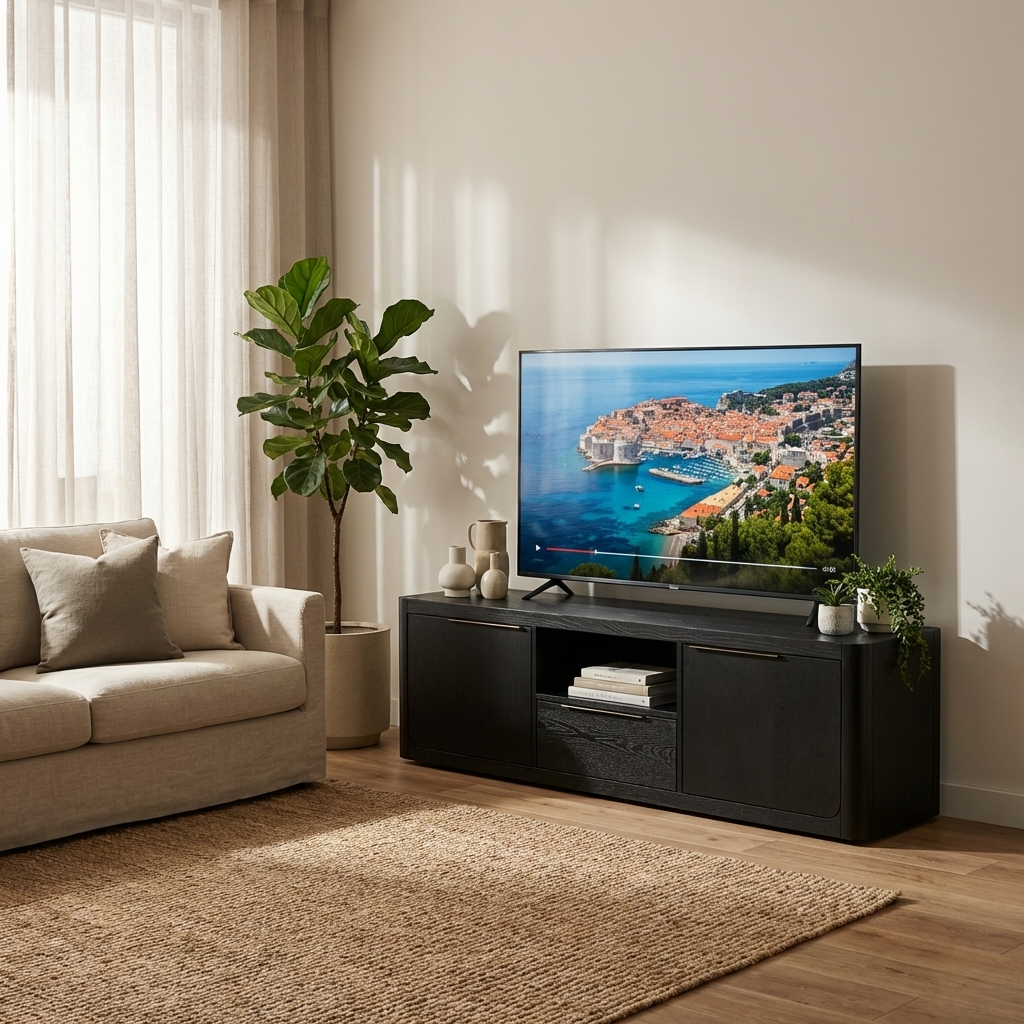 Liverpool 2 Door 1 Drawer TV Unit (Black) blends modern sophistication with everyday functionality. Crafted from solid Pine and MDF Oak, it features two cabinets, a central drawer, and an open shelf for media storage, finished with smooth rounded edges for a bold, contemporary look.