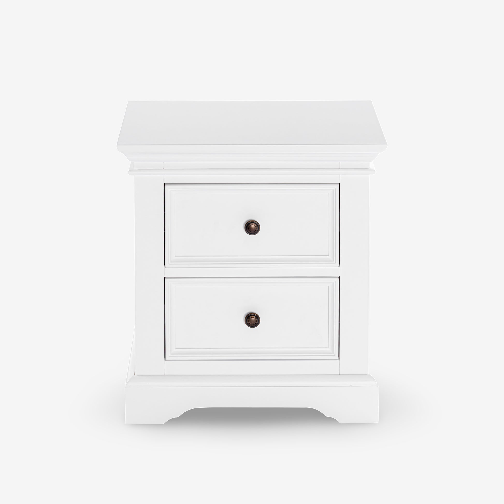 The London Bedside Table offers simple elegance with practical storage. Featuring two smooth-gliding drawers with round silver handles, it combines a crisp white finish and classic panelled design for a timeless look. Its compact size makes it perfect for keeping essentials close at hand while adding a touch of refinement to your room.
